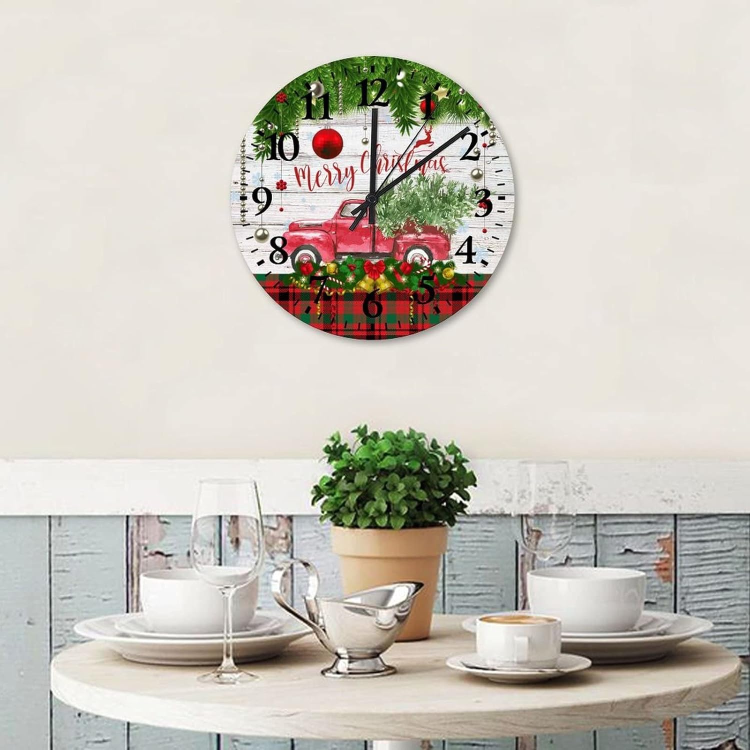 Merry Christmas Tree Truck Wooden Wall Clock Red Truck and Trees farmhouse clock Silent & Non-Ticking Arabic Numeral Clock Farmhouse Home Decoration 15 Inch??Details:Product Size: 10/12/15 inches, (25/30/38 cm)Shape:RoundMaterial: Wood??Functional Home DécorThis Red Truck with Xmas Tree Winter Holiday Christmas clock aren't just for timekeeping. They function as beautiful wall decor pieces, beyond telling time, and bring both style and purpose to any room.A charming home decoration, very suitable as a housewarming gift, making the home more warm. Suitable for any room, you can put it in any room such as home, living room, master bedroom, kitchen, bathroom, home office, etc. Elegant, durable and stylish.??Clock Hands Troubleshooting Guide:Check that the battery is a new battery and not a used battery.Make sure the hour and minute hands are not crossing or touching each other. If they are, adjust the hands by slightly bending them.See if the center pin that holds the hands together is firmly pushed in or screwed on, depending on the style.If hands are still not moving after the above, please reference the hands replacement instructions included with all of our open face clocks.