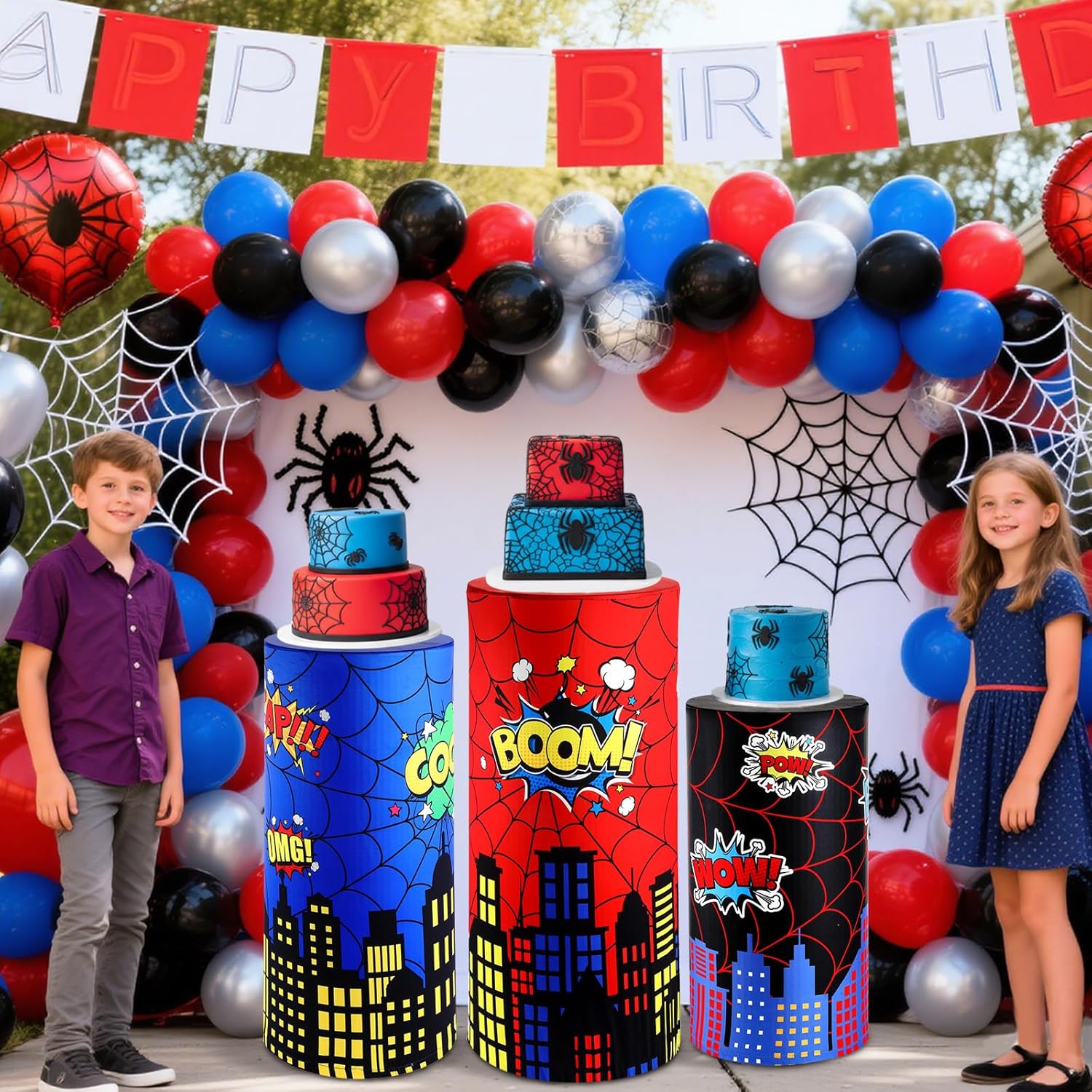 3 Sets Spiderweb Themed Spandex Cylinder Stand Covers Red Blue Cake Pedestal Cover Dessert Table Gift Display Round Cylinder Stand Covers for Birthday Party Baby Shower Backdrop Wedding Props Decor This spiderweb-themed cover set comes in red, blue, and black with distinct sizes, great for dressing up standard cylinder pedestals without the need for extra stands. The milk silk fabric blend ensures a smooth, wrinkle-resistant finish that stays neat through storage and repeated event use. Featuring eye-catching spiderweb patterns paired with comic-style accents and cityscape backdrops, the cylinder stand covers add a playful, vivid touch to party displays. The elastic fabric slips on easily for a snug, non-slip fit, concealing pedestal flaws while elevating the look of dessert tables, gift stations, or backdrop props for birthdays, baby showers, and more. Specifications: Material:Polyester and spandex Color: Colorful Size: Cylinder stand covers:128×90cm / 50.4×35.4inch Round cylinder stand covers:115×75cm / 45.3×29.5inch Spandex cylinder pedestal covers:105×60cm / 41.3×23.6inch Package Includes: 3 sets spiderweb themed spandex cylinder stand covers