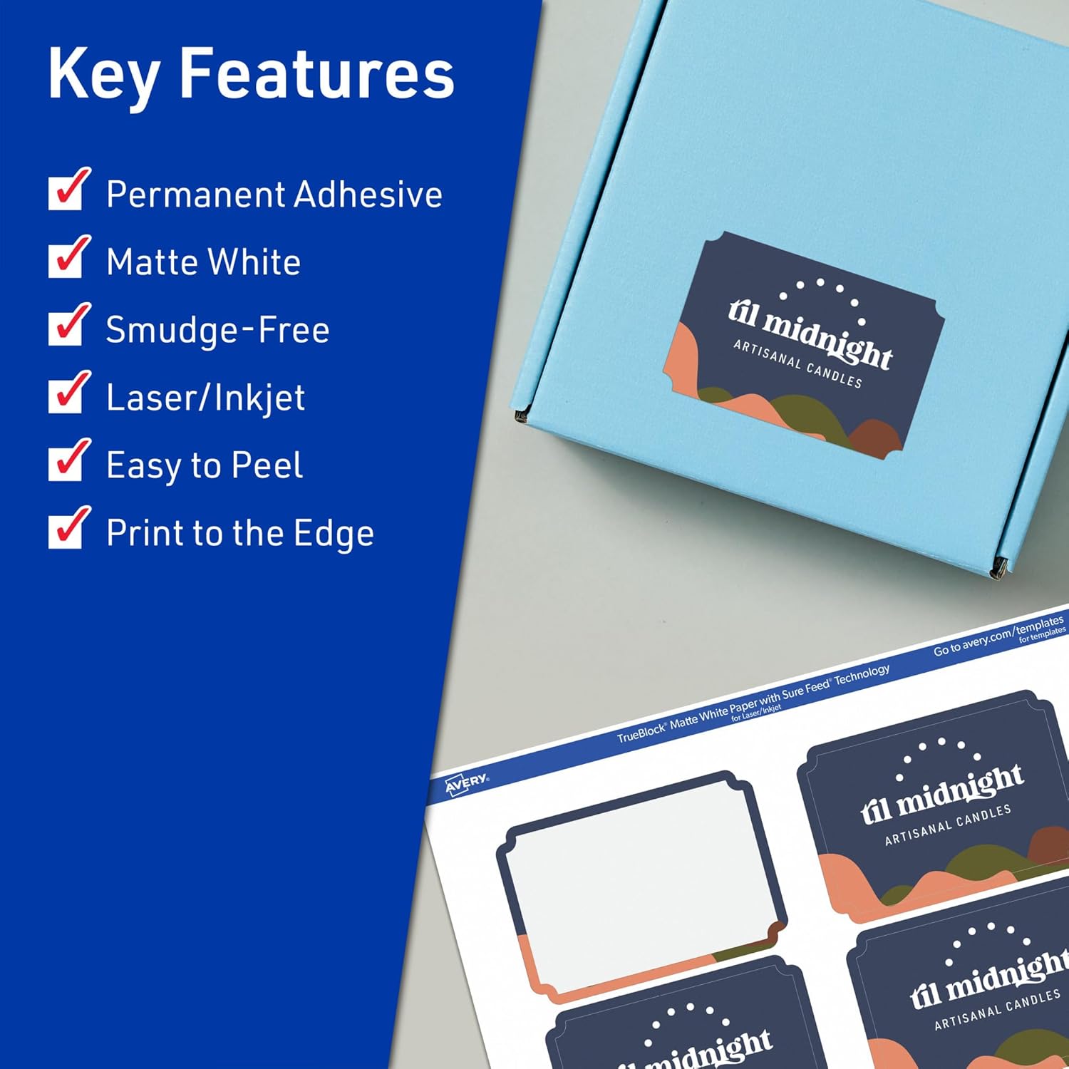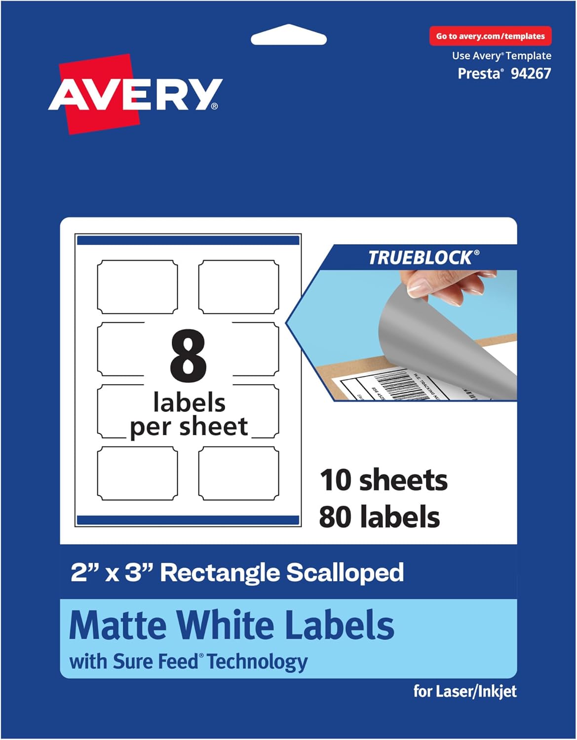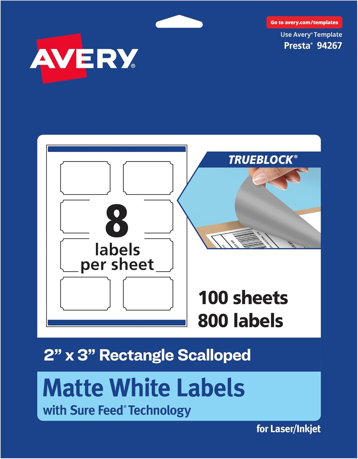 Easily update old information and create mailing labels, product labels, soap labels, and more with Avery TrueBlock 2" x 3" Matte White Rectangle Scalloped Labels. Easily revise old labels with Avery TrueBlock technology. The proprietary TrueBlock feature completely covers up markings and printing so that none of your old data shows through. This also provides better contrast for your new print to stand out on a completely white background. The permanent adhesive makes sure that your labels stick and stay to a variety of surfaces without peeling, curling, or falling off. Avery rectangle scalloped labels are carefully constructed with top features to provide the best results. Sure Feed technology reduces jams and smudges by creating a more reliable feed through your printer. The print-to-the-edge layout lets you print beautiful full-bleed designs that fill each blank sticker to the edge. Easily customize labels for food containers, candle jar labels, body scrub labels, and more with your own art, symbols, and messaging by using the templates and designs on the Avery website.