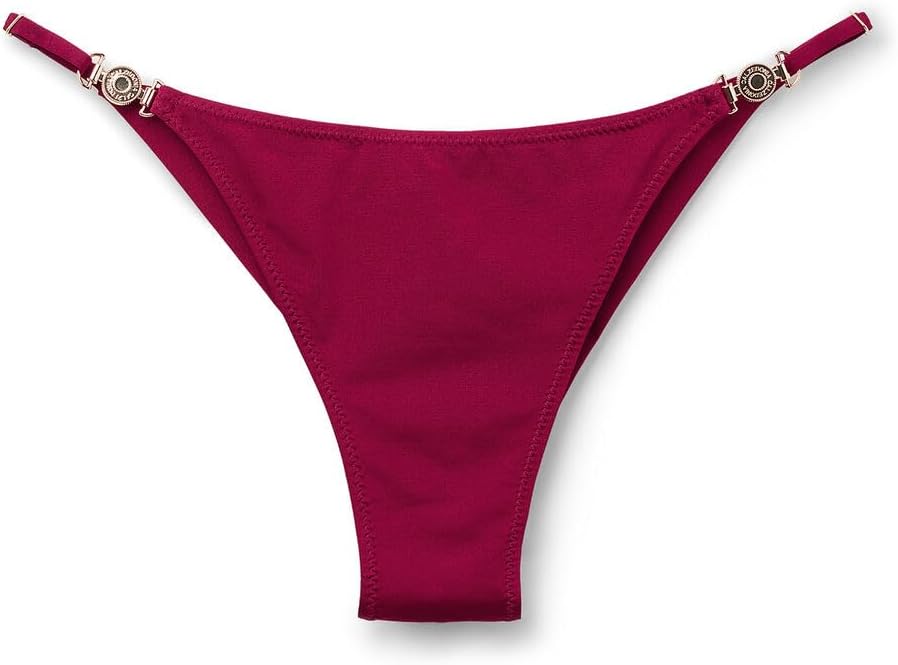 Brazilian bikini bottoms with adjustable side panels, featuring a minimal fit that exalts the silhouette with a touch of sensuality and refinement. The slightly rounded waist at the front allows for both a regular and more high-cut fit, depending on one's physique. The bright silk-effect fabric embellished by elegant golden details radiates a sophisticated sensation of discrete luxury. Fully lined with invisible seams.