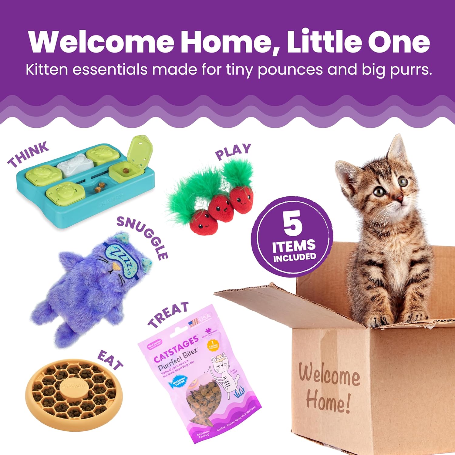 Welcome your new feline friend with the Outward Hound New Kitten Bundle—a curated starter set designed to delight, comfort, and stimulate your kitten from day one. Whether your kitty is feeling playful, curious, or cozy, this bundle includes everything to support their mental and physical development while strengthening your bond. Encourage natural foraging instincts and slow healthy eating habits with the Cat Slow Feeder Bowl, made just for small mouths. The Kitty Cube Puzzle Toy provides engaging hide-and-seek fun, while the Strawbabies Catnip Toys add soft, lightweight swatting entertainment your kitten will love. When it’s time to rest, the Lavender Scented Purr Pillow mimics a cat’s soothing purr to help reduce anxiety and promote restful naps. Finish it off with a pack of Purrfect Bitez Whitefish Treats, made with real fish to reward good behavior and keep your kitten coming back for more. This bundle makes the perfect welcome-home gift for new kittens and first-time cat parents. Thoughtfully crafted by Outward Hound to bring joy, comfort, and fun to every new beginning.