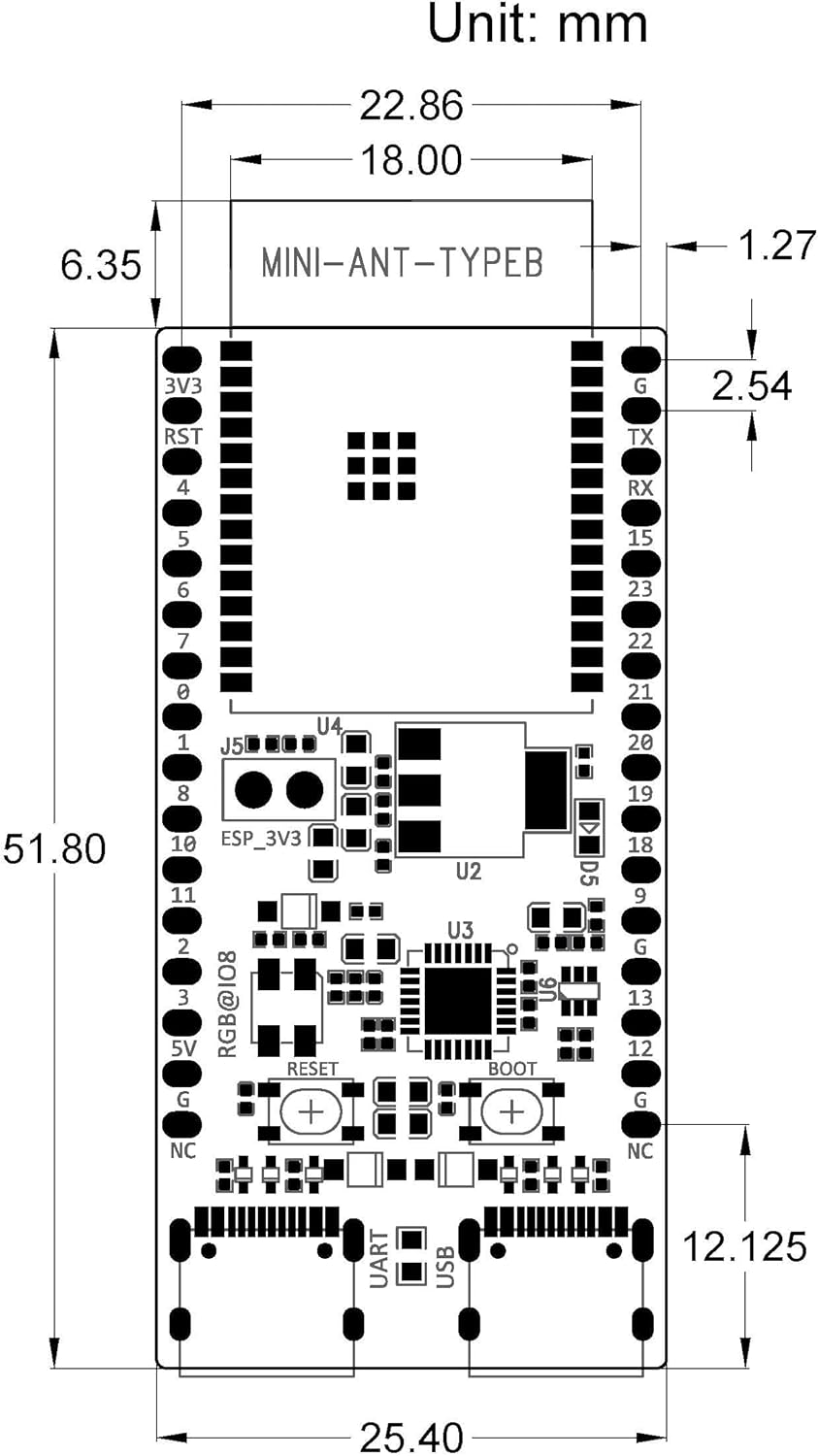 Features: CPU and On-Chip Memory ESP32-C6 embedded, 32-bit RISC-V single-core microprocessor, up to 160 MHz ROM:320 KB HP SRAM: 512 KB LP SRAM: 16 KB Wi-Fi: 1T1R in 2.4 GHz band Operating frequency: 2412~2484 MHz IEEE 802.11ax-compliant Fully compatible with IEEE802.11b/g/n protocol Blue-tooth: BluetoothLE: Bluetooth5.3 certified Blue-tooth mesh High power mod (20dBm) Speed:125Kbps, 500Kbps, 1Mbps, 2Mbps Advertising extensions Multiple advertisement sets Channel selection algorithm#2 LE power control Internal co-existence mechanism between Wi-Fi and Bluetooth to share the same antenna IEEE802.15.4: Compliant with IEEE802.15.42015 protocol OQPSK PHY in 2.4 GHz band Data rate: 250Kbps Thread1.3 Zigbee3.0 Peripherals: GPIO, SPI, parallel IO interface, UART, I2C, I2S, RM (TX/RX), pulse counter, LED PWM, USB Serial/JTA Gcontroller, MCPWM, SDIO2.0 slave controller, GDMA, TWAI controller, on-chip debug functionality via JTAG, event task matrix, ADC,temperature sensor,general-purpose timers, watchdog timers, etc. Integrated Components on Module: 40 MHz crystal oscillator SPI flash Applications: Smart Home Pos machines Industrial Automation Service robot Health Care Audio Devices Consumer Electronics Generic Low-power loT Sensor Hubs Smart Agriculture Generic Low-power loT Data Loggers Package includes: 1 X ESP32-C6-DevKitC-1 N8 development board