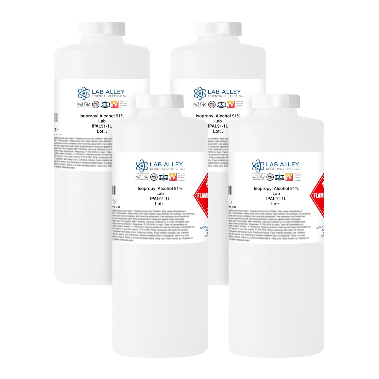 Isopropyl Alcohol is a high purity grade chemical solution. Isopropyl Alcohol 91 Lab solution is a high-quality product that is ready-to-use in households, scientific laboratories, business operations and industrial production. This safely packaged product is made in America. This premium brand of Isopropyl Alcohol 91 Lab solution can be shipped to your home, research facility or business. Isopropyl Alcohol 91 Lab solution has many important practical uses, applications and benefits in daily life, manufacturing operations and scientific research. Synonyms and other names for Isopropyl Alcohol are Isopropanol, 2-propanol, Isopropyl Alcohol, 2-hydroxypropane, Alkolave, Avantine, Hartosol, Dimethy lcarbinol, Sec-propyl alcohol and Petrohol. Chemical properties and identifiers: chemical formula C3H8O, mass 60.10 g/mol, CAS number 67-63-0, PubChem CID 3776, UN Number 1219.