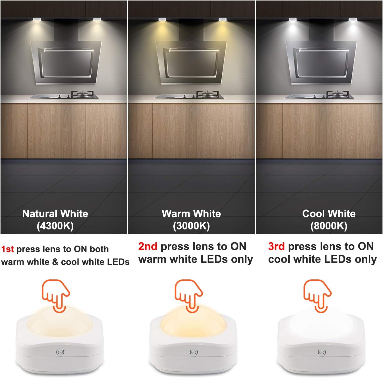 Details:ALL of our products has 12 months warranty welcome to contact us if you had any questions.Wattage: 0.65Lumens:60LMVoltage of Light: DC4.5V (3*AA Battery)Lifespan:30000HoursColor Temperature: 3000K Warm White and 8000K Cool WhiteMounting: Tape or MagnetPackage:-4 x Under counter Light-2 x Remote control-4 x strong double sided tape-4 x Screws