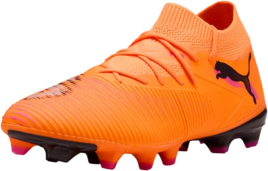 Playmakers, unleash your creativity with PUMA Future 8 Match Firm, Artificial Ground Soccer Cleats. The soft, lightweight mesh upper improves fit and stability while the raised mesh lines with GripControl finish enhance grip on the ball. The stud shape and placement around the pivot point enable 360-degree agility and freedom of movement, so you can shake off defenders with ease. The lace-up sneakers come with a polyester lining, ethylene vinyl acetate insole for comfort, and PUMA® cat logo at the heel counter for authenticity.