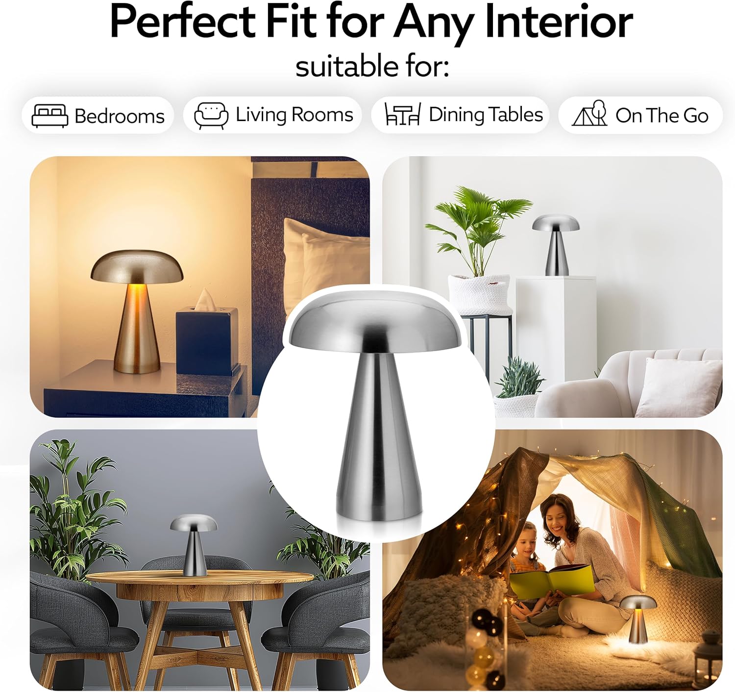 Silver Metal Mushroom Table Lamp Battery powered LED Easily recharged with a universal USB cable that is provided with the lamp Keeps a charge for up to 12 hours Wireless and rechargeable features allow for easy mobility and placement of lamp in any room No unattractive, unslightly wires to look at beacuse of wireless feature Three different light tone settings to choose from by tapping the top of the lamp 3 step color (low, medium, high) dimmable touch table lampAccent lamp which casts a soft and gentle glow Exquisite silver finish with a slight shine to enhance any room's decor Size: 6.3"D x 6.3W x 8.7"H inches Please reach out to us if you have any issues, for your satisfaction is our top priority