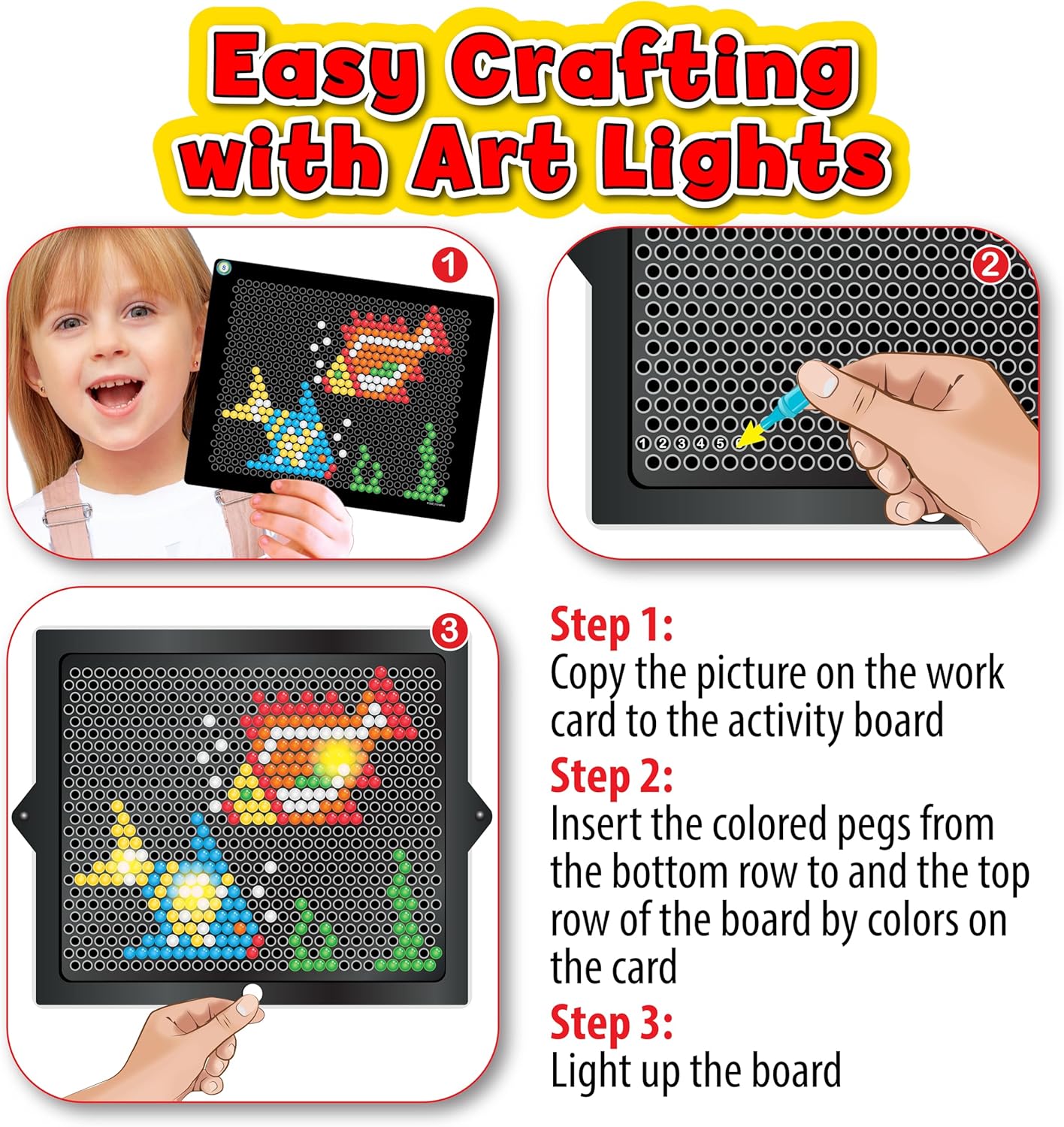 Designed for children ages 4 and up, this innovative craft kit allows kids to create dazzling, illuminated pictures by arranging 288 colorful pegs on 12 vibrant model sheets. With simple, step-by-step instructions, young artists can easily follow patterns or design their own unique creations, enhancing their fine motor skills and artistic expression. The battery-operated light board adds an exciting twist to their artwork. With just a push of a button, their designs come to life, providing a visually rewarding experience that encourages creativity and independent play. This toy not only entertains but also helps develop problem-solving skills and spatial awareness through hands-on activities. Crafted from high-quality, child-safe materials, the peg board set is built to last. The pegs are designed for easy gripping, ensuring that little hands can comfortably and safely engage in hours of creative play. The set is a modern take on classic games for kids, combining fun and education in one fantastic package. Whether for a birthday, holiday, or just because, Small World Toys Art Lights make a perfect gift that brightens up playtime and fosters a love for creativity. Ideal for group activities, family bonding, and independent fun, this light-up peg board is sure to be a hit with kids and parents alike. Note: Requires 3 AA batteries (not included) for operation.