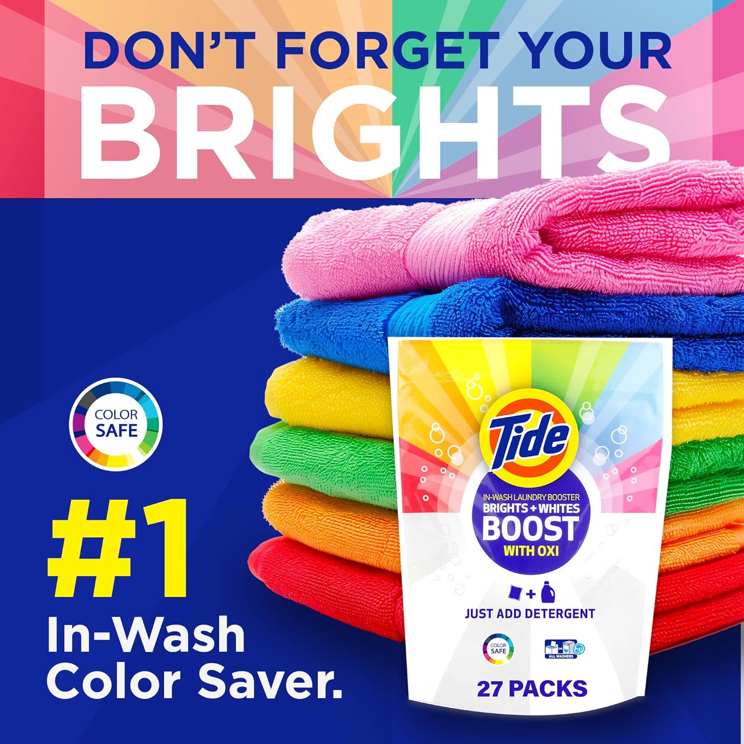 Tide Bright + whites Rescue color safe In-Wash laundry booster pacs get clothes up to three shades whiter in one wash*! they're formulated to fight dinginess and dullness, and help restore and brighten whites. Tide Bright and whites Rescue pacs prevent yellowing by breaking down body soils and residues, so you can be sure your whites stay white, and your colors are kept safe. For best results, add Tide Bright and whites Rescue pacs to your wash along with your favorite Tide PODS laundry detergent pacs. They can be used with regular and HE washing machines, both front- and top-loaders. *when washing with base Tide Liquid detergent