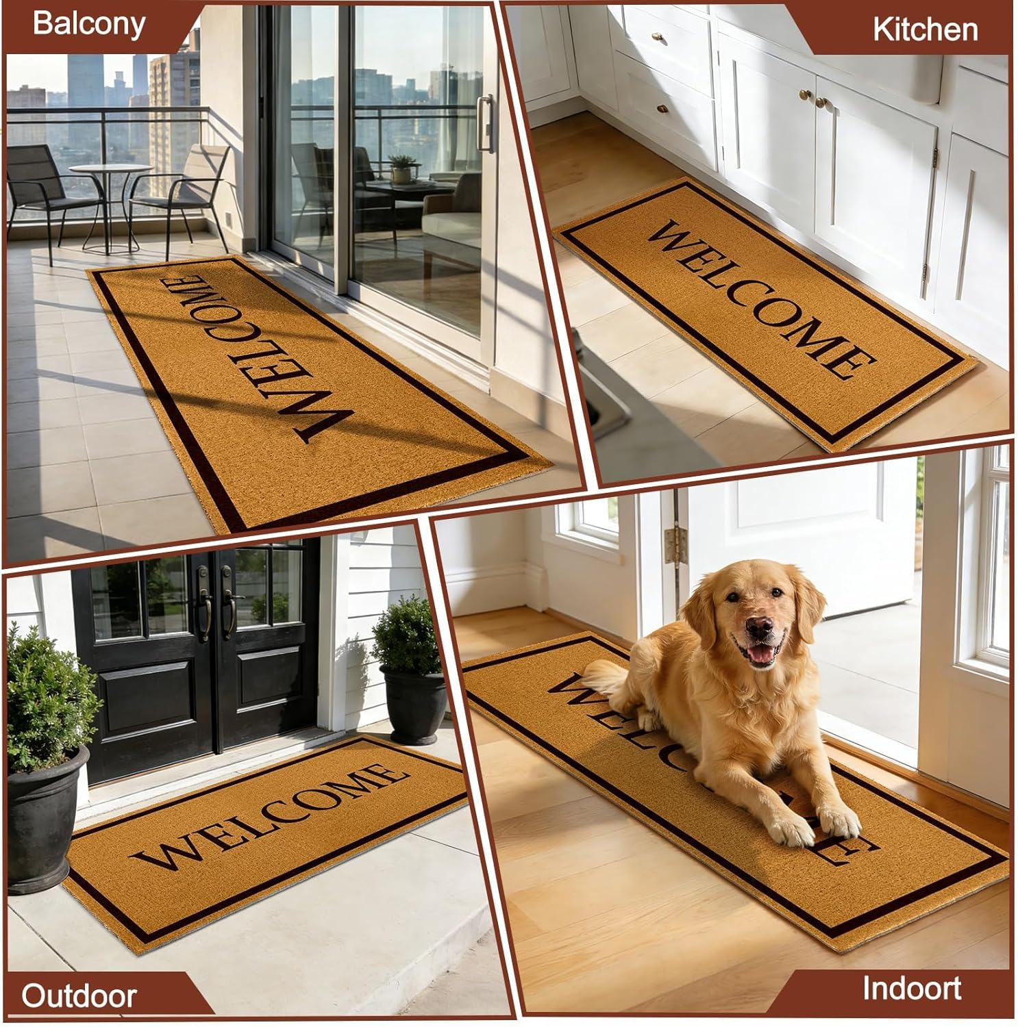 Features: Low Maintenance Care: Cleaning the large welcome door mat is straightforward; simply shake it off, sweep with a broom, or use a vacuum to remove trapped particles. The fibers are designed to release dirt easily, ensuring the rug maintains its tidy appearance with minimal effort required from the homeowner Heavy Duty Construction Built to withstand daily foot traffic, this long door welcome mat utilizes a thick pile bonded firmly to the backing. The structure resists shedding and fading over time, ensuring the greeting remains visible and the scraping function stays effective throughout changing seasons and frequent usage. Specifications: Material: PVC & Coir Color: Brown Size: 24 x 60 Inches Theme: Welcome Style: Rustic Occasion: Housewarming / Wedding / New Home Fabric Type: Coir Fiber Target Audience: Homeowners / Interior Designers Age Range: Adult Number of Pieces: 1 Shape: Rectangular Special Feature: Heavy Duty / Scrapes Dirt / Non Slip / Low Profile Number of Items: 1 Notes: Manual measurement, please allow slight errors on size. The color may exist a slight difference due to different screen displays.
