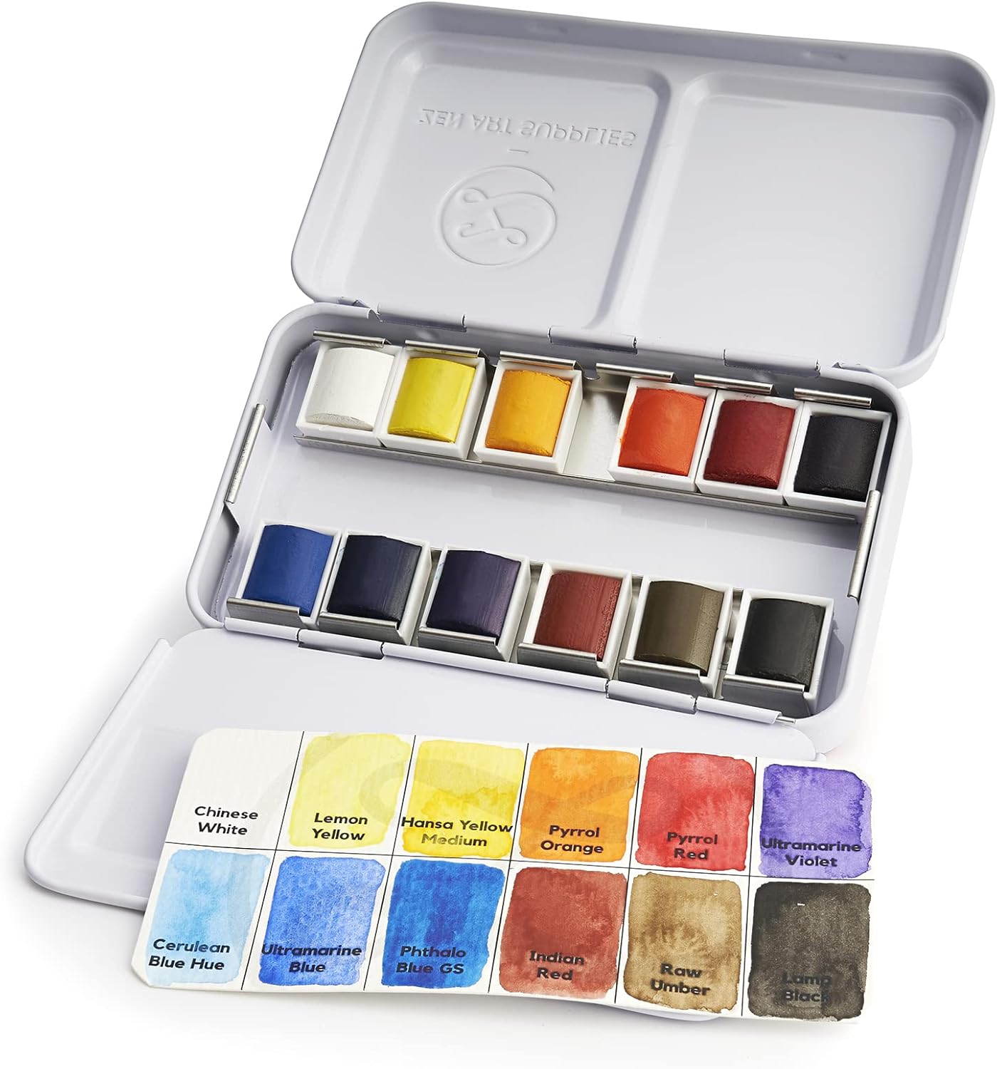 Find Zen through Art! While some other watercolor paint sets are student grade (yet called professional), not so vibrant or create muddy color mixes, the Virtuoso Artist Watercolours by ZenART have a carefully selected palette of highly pigmented non-toxic water colors, which produce vibrant results without compromise. This means enjoying painting and finding your Zen through Art. You'll receive 12 high quality paints (half-pans), good to learn color mixing - no artist needs too many colors. We suggest to use Classico or Moderno as your primary palette, adding Vista or Sorriso for specific purposes: Vista - for landscapes or sketching, and Sorriso for painting people or animal portraits. Our watercolors conform to ASTM D4236, non-toxic and vegan-friendly. Artist grade means good pigments (single pigment are used where possible), transparency and vibrancy. Our products come with 1-year satisfaction guarantee. The beautifully designed and compact metal palette box is sturdy and perfect for travel/ home/ studio. Vibrant and rich colors dry quickly and thanks to high pigment load, will last longer. All our products, including these watercolor paint sets are designed by our co-founder and artist Ardak Kassenova, and tested by fine artists to bring the best sets on the market. Professional Watercolor Paint sets feature original artworks of our brand-ambassador Anastasia Shimshilashvili (@art.shima) - multi-award winning fine artist and bestselling author. Get your ZenART travel set, start creating a better art and better life! CLASSICO 12: Artist’s Primary Palette Chinese White PW6, Lemon Yellow PY3, Hansa Yellow Medium PY1/PO13, Pyrrol Orange PO13, Pyrrol Red PR21/PR13, Ultramarine Violet PV23, Cerulean Blue Hue PB15, Ultramarine Blue PB29, Phthalo Blue GS PB15:3, Indian Red PR101, Raw Umber PBk7/PY42, Lamp Black Pbk7 Size: 4.7 x 2.7 x 0.9 inches - Weight: 6.5 oz